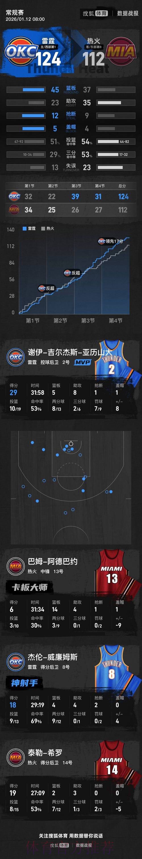 雷霆强势止连胜 热火主场陷入冷却时刻 当热火带着三连胜的余温回到主场时,很少有人预料到,他们会在一场看似势均力敌的较量中,被一支年轻的雷霆彻底浇灭气势。比赛的转折点,不是某一次绝境三分,也不是最...